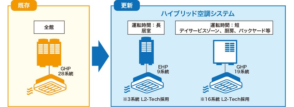 | 施工内容 | 施設内の空調システム、照明設備の更新工事 1)電気式(EHP)、ガス式(GHP)による「ハイブリッド空調システム」の導入 2)全館の照明のLED化 |