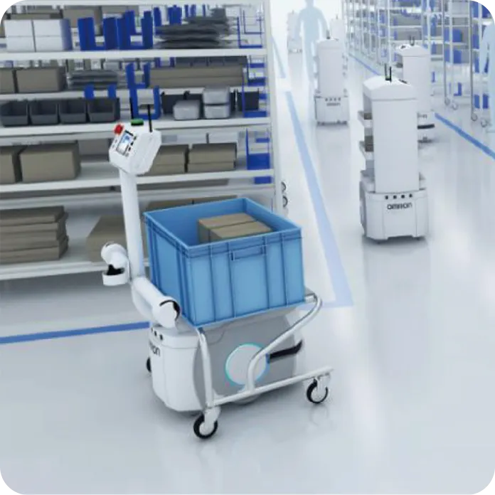 - 倉庫管理システムの指示から最短経路を自動探索し搬送。移動距離と停滞を削減し、供給を安定化。