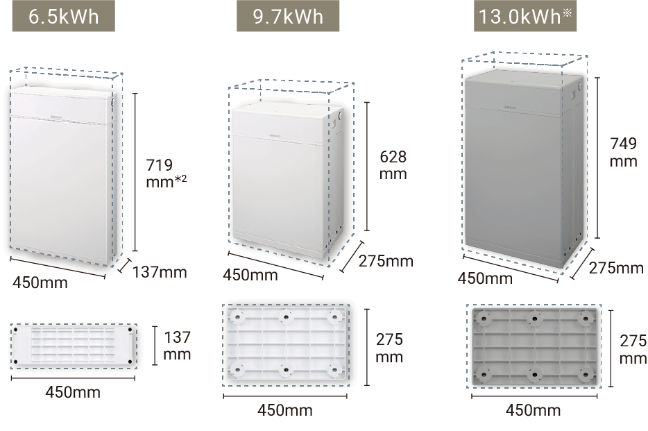 - *1. 自立設置の場合、16.4kWh、9.8kWhタイプおよび12.7kWh、6.3kWhタイプはコンクリートにアンカー固定、6.5kWhはコンクリートにアンカー固定と壁面への固定が必要です。本ページの自立設置写真は簡易基礎での設置イメージです。