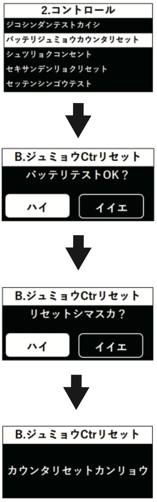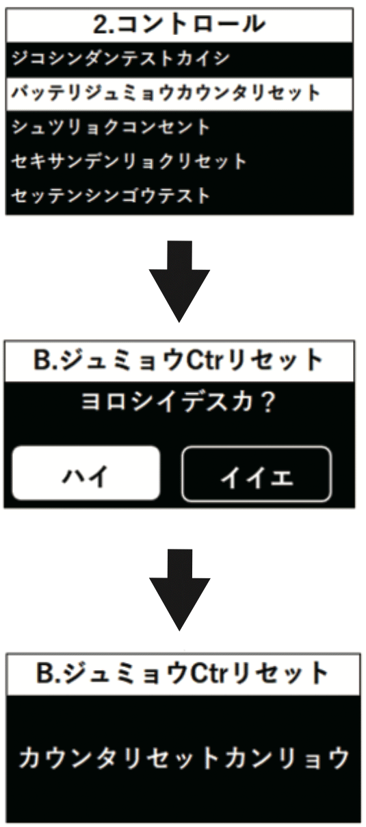 バッテリ寿命カウンタをリセットします。問題なければ「ハイ」を選択してください。