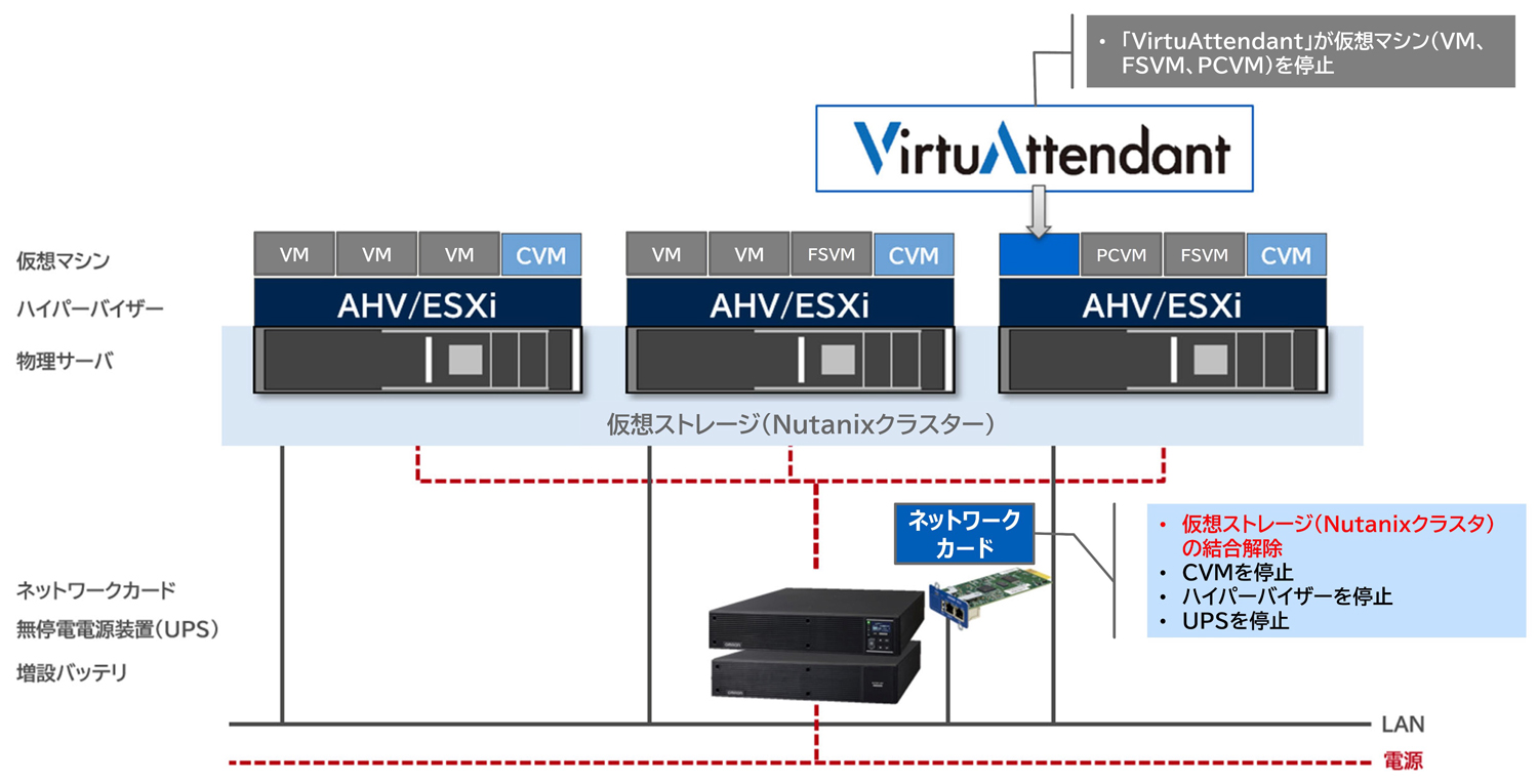 UPSの入力プラグを商用コンセントから抜いてのバックアップ運転や、仮想マシンとハイパーバイザーなどをシャットダウンせずに、ボタンひとつで仮想マシンのみをシャットダウンするテストを行うことができ、UPS関連のテスト工数を低減できます。![]() |