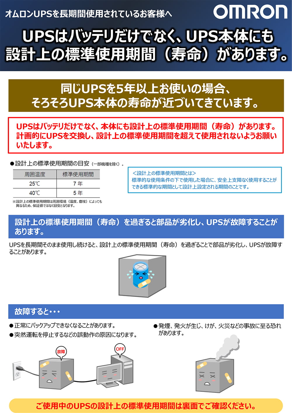 UPSはバッテリだけでなく、本体にも設計上の標準使用期間があります。計画的にUPSを交換し、設計上の標準使用期間を超えて使用されないようお願いいたします。